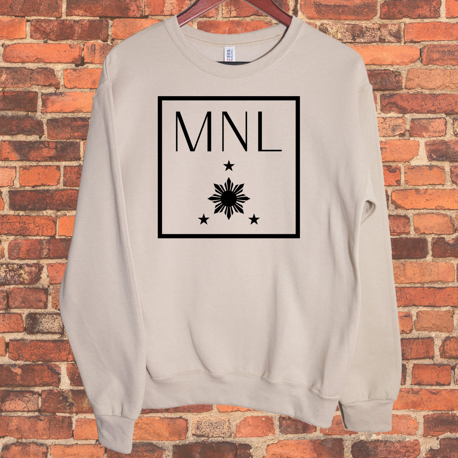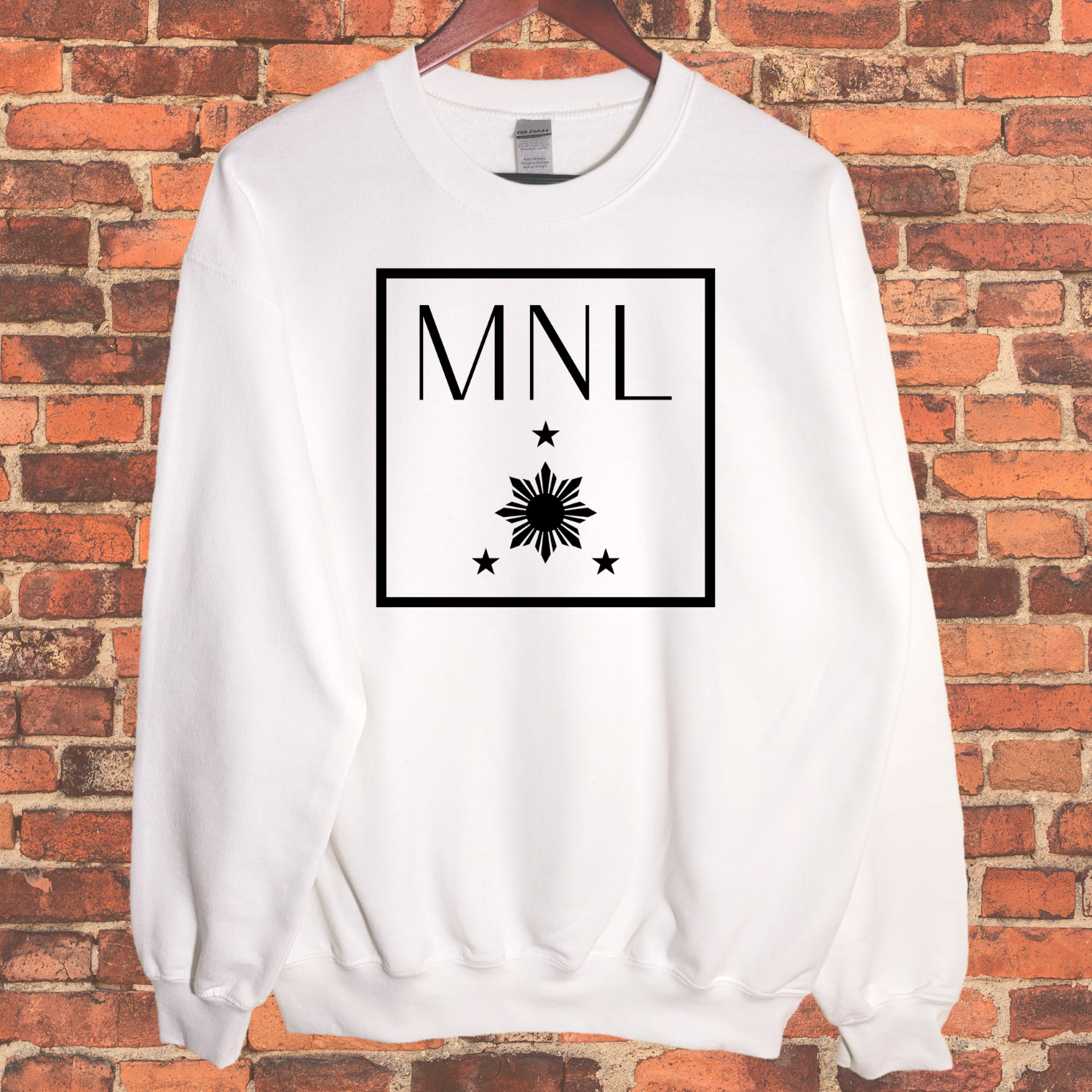 MNL stands for Manila, which is the capital of the Philippines. It is designed with 3 stars and a sun from the Philippines flag. MNL Sweatshirt is available on colors Black (with white and yellow print), White, Maroon (with white and yellow print), Sand, and Gray.